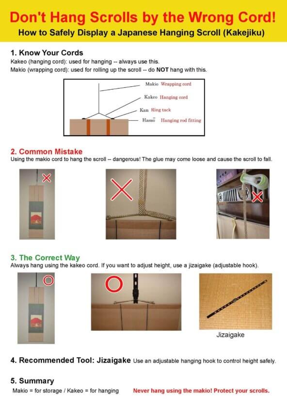 By correctly distinguishing between the kakeo and the makio, you can display your precious kakejiku safely and beautifully.