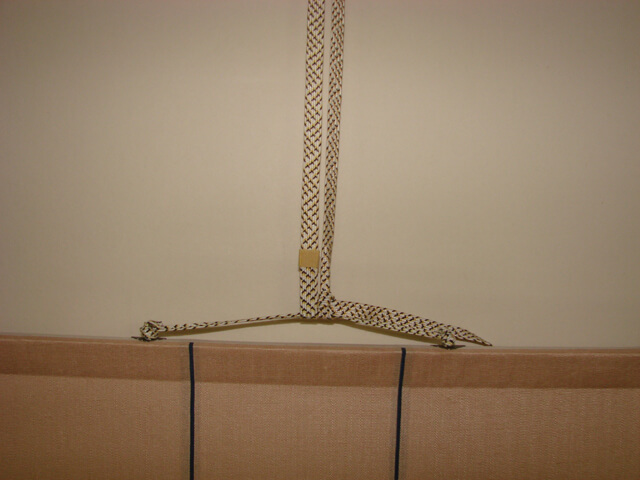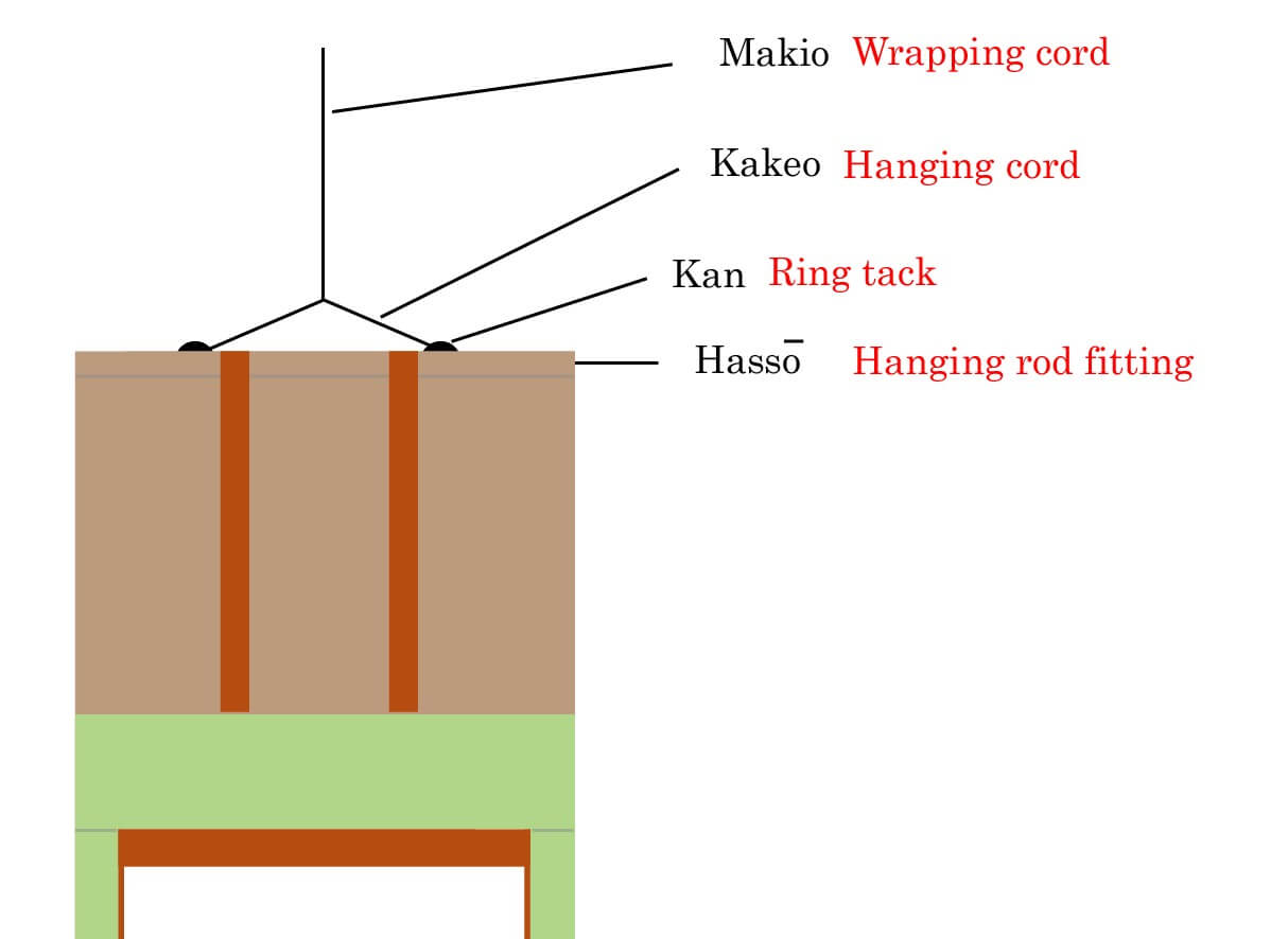 The second cord, which is attached to the kakeo, is called the makio (巻緒). This longer cord is used only when rolling up the scroll for storage — it is wrapped around the scroll to keep it tightly secured.