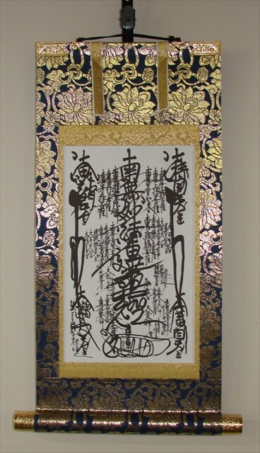 Here is the newly finished Nichiren Mandala hanging scroll. Thanks to the effect of the “mawashi,” the mandala appears even more striking.