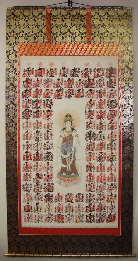 It enhances both the purity of the central Kannon figure and the powerful presence of the one hundred vermilion stamps.