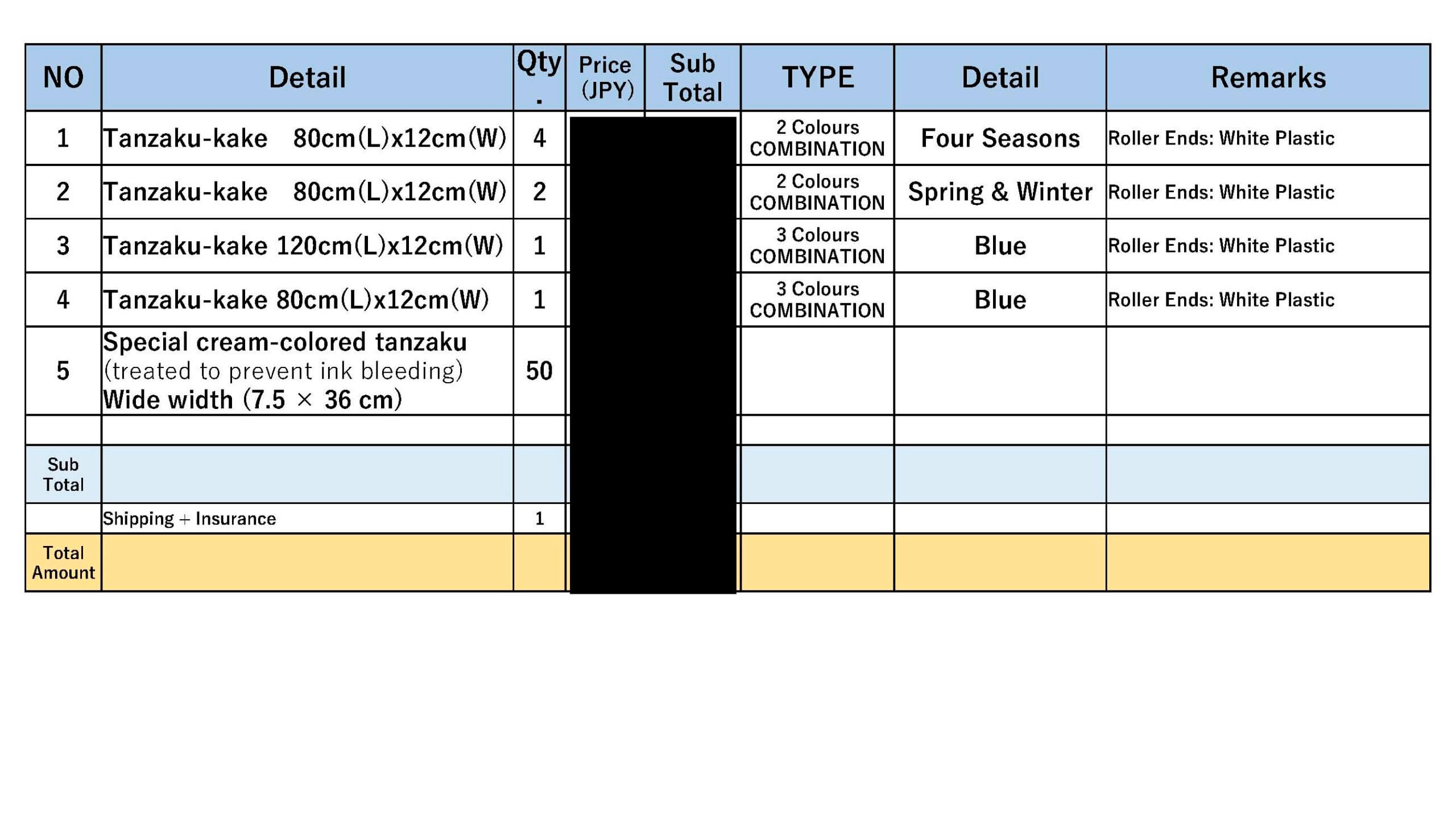 The order details are as follows. In addition to a four-season set of Tanzaku-gake, we were also asked to produce blue-themed Tanzaku-gake, as well as tanzaku sheets with anti-bleed treatment.