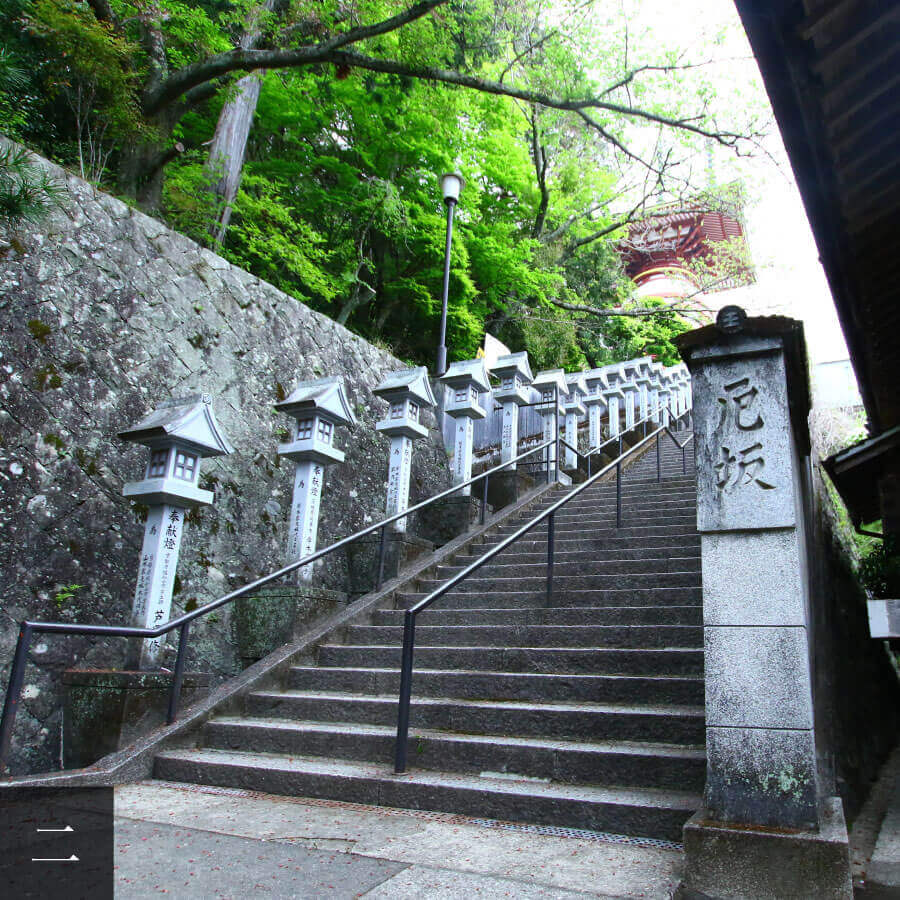 The bridge over the small waterway in front of the Sanmon (Mountain Gate) is known as the “Yaku-yoke Bridge.” Crossing it, passing through the Niō-mon Gate, and proceeding along the approach with the Shōrō (Bell Tower) on the right, you first reach the 33 stone steps of the Onna-Yakuzaka (Women’s Calamity Slope). At the top is the Ema Hall, and from there the Otoko-Yakuzaka (Men’s Calamity Slope) continues with 42 stone steps. It is customary for those in yakudoshi (critical years) to place small coins on each step as they ascend, praying to cast off misfortune.